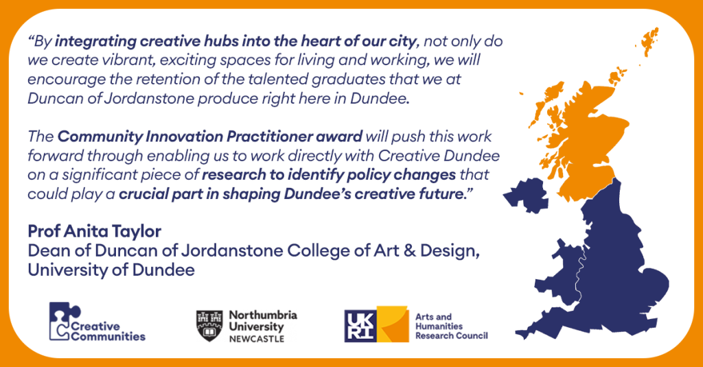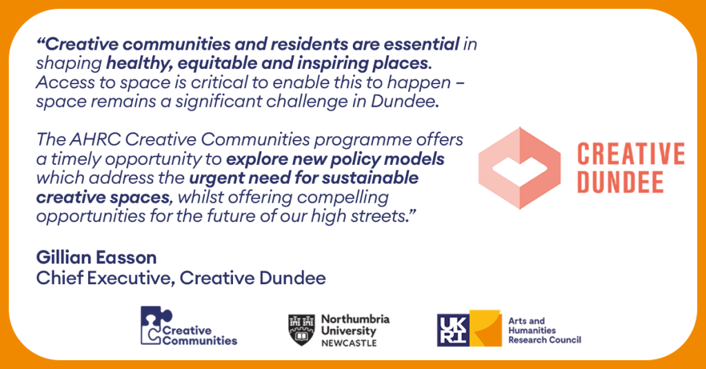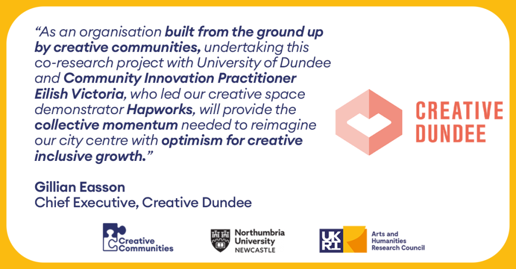 For over 20 years, the University of Dundee has worked in partnership with organisations across Dundee, using culture as a means to regenerate the city. Through the ‘Creative Spaces as Catalysts for City Centre Regeneration’ project, the University of Dundee’s will work in partnership with Creative Innovation Practitioner Eilish Victoria and Creative Dundee – an organisation deeply rooted in the city and exploring the issue of creative space though their Hapworks project.